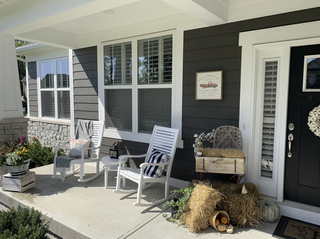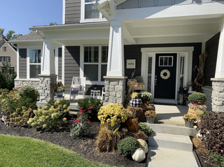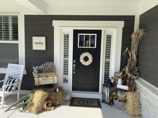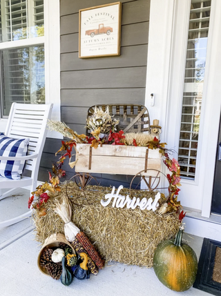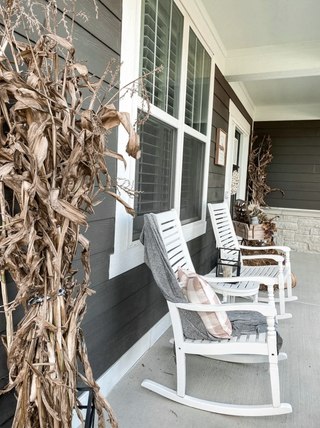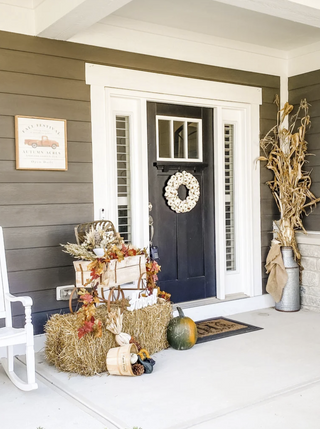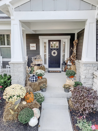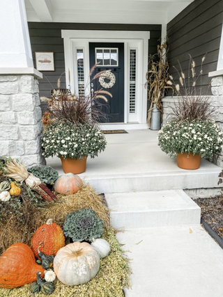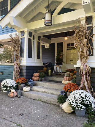 As soon as labor day arrives, the excitement for fall porches arrives! You can never have too many pumpkins to layer on hay bails or your steps. Adding height with real dried out corn stalks is the perfect addition as well.Â