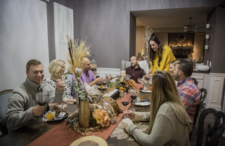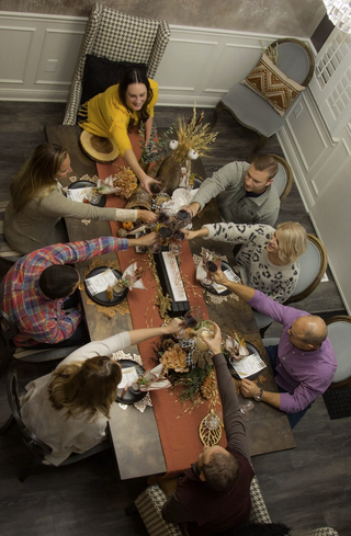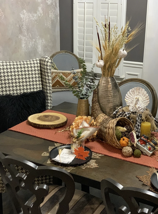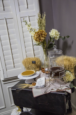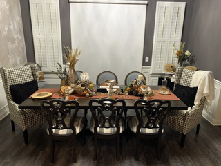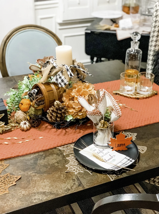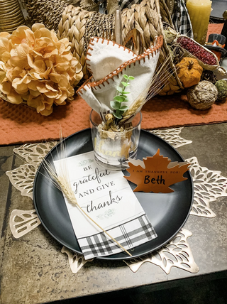 Celebrating friendships during the Thanksgiving season is something to cherish. No gifts, just time and wonderful food with great friends is such a blessing. We stuck to a traditional color pallet for the decorations, but added a black gingham pattern throughout the displays for a nice pop. Our favorite element was the napkin display with wooden napkin holders set in a glass so that all utensils were together for pizaz and functionality.